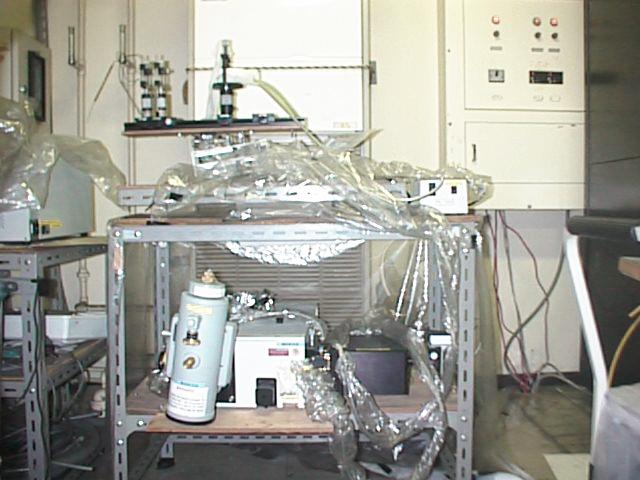| これは,四重極質量分析装置(通称 Q-MASS)です。装置の商品名から私たちは IDP と呼んでいます。簡単に言うと,プラズマ中にどんなものがいるかを調べる装置です。Q-MASS は普通,かなり低い圧力中のものしか測定できませんが,この IDP は,かなりでかいポンプを持っているので,高い圧力中でも測定できます。また,質量数が 3000 というとても大きな値まで測定できるので,高次フラーレン等も計測可能です。こう書くと,すごい装置のように思いがちですが,実際のところ測定はうまくいってません。どうも,フラーレンのような重いものは,検出部まで入っていかないようで。はっきり言ってこの装置は,ただでかいだけで邪魔です。私はこの装置に,肘や背中を頻繁にぶつけて痛い思いをしています。
